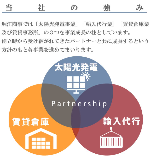 新しいマーケットを開発するために、商品サイクルの見直しをしながら新しい視野・違う角度から絶えずビジネスを考えるのが堀江商事株式会社の社風です。ビジネスパートナー様との提携により、更なる新しいビジネスの展開を目指します。